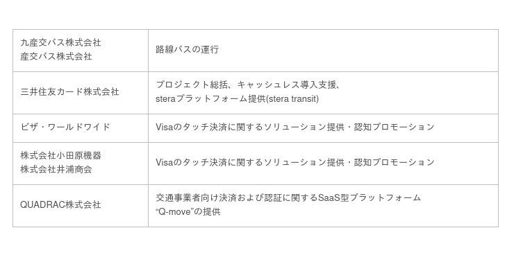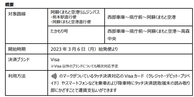 九州産交バス株式会社(本社:熊本県熊本市、代表取締役社長:岩崎 司晃、以下「九産交バス」)、産交バス株式会社(本社:熊本県熊本市、代表取締役社長:久本 正則、以下「産交バス」)、三井住友カード株式会社(本社:東京都江東区、代表取締役社長:大西 幸彦、以下「三井住友カード」)、ビザ・ワールドワイド・ジャパン株式会社(本社:東京都千代田区、代表取締役社長:スティーブン・カーピン、以下「Visa」)、株式会社小田原機器(本社:神奈川県小田原市、代表取締役社長:丸山 明義、以下「小田原機器」)、株式会社井浦商会(本社:福岡県福岡市、代表取締役社長:井浦 正之)、QUADRAC株式会社(本社:東京都港区、代表取締役社長:高田 昌幸)は阿蘇くまもと空港の新旅客ターミナルビルの開業にあわせて、2023年3月6日より空港リムジンバスにVisaのタッチ決済を導入することを発表いたします。