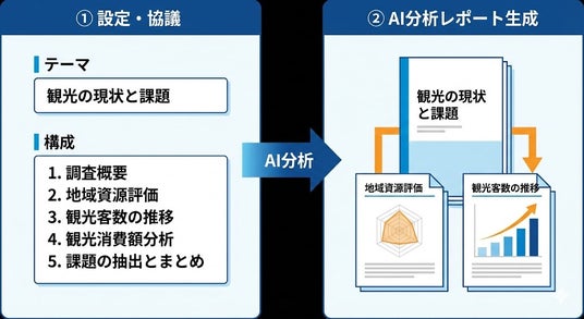 「観光の現状と課題」「インバウンド動向分析」など、テーマを自由に設定できます。地域の優先課題に合わせた切り口でレポートを生成できます。