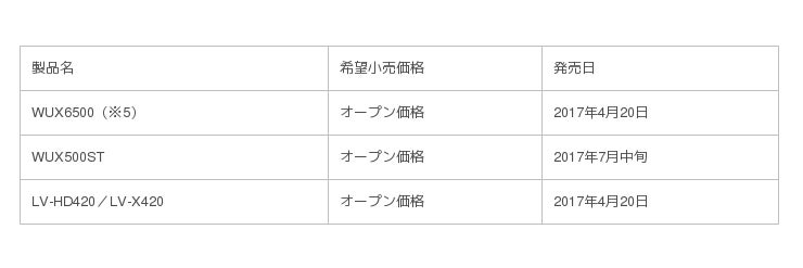 ※1 “WUX6500”は「WUX6010」(2016年4月発売)、“WUX500ST”は「WUX450ST」(2016年4月)、“LV-X420”は「LV-X320」(2015年11月)の上位機種。