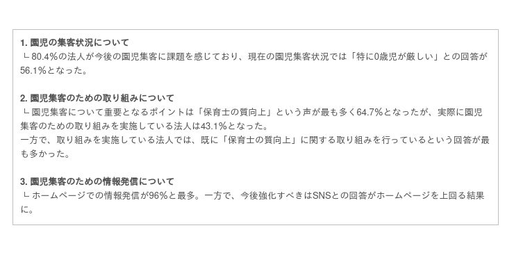 保育施設の増設により、待機児童が全国で減少する中、各地で「定員割れ」が目立ちはじめました。今回の調査では、保育施設を運営する法人の8割が今後の園児集客に課題を感じており、その中でも特に「0歳児の集客が厳しい」との回答が半数以上にのぼりました。"選ばれる保育園”になるためには、園児集客について何らかの対策を講じる必要性があり、その重要となるポイントについては「保育士の質」であるという声が最も多く、今後も保育士の質を向上するための取り組みや情報発信の強化が求められる結果となりました。
