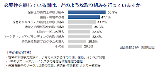 実際に行っている園児集客の取り組みとして最も多かったのは「保育士の質向上の取り組み」で、55.9%となった。次いで「設備・環境の改善」が47.1%、「保育カリキュラムの質向上の取り組み」が41.2%となった。また、その他回答として「子育て支援ひろばの再開・強化」、「インスタグラムでの発信開始」、「ホームページリニューアル」、「体操・サッカー教室」などの声もあがった。
