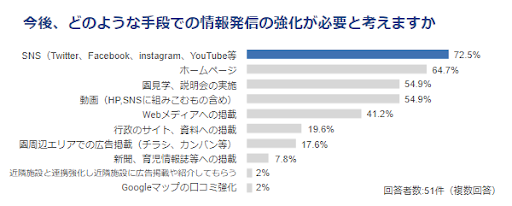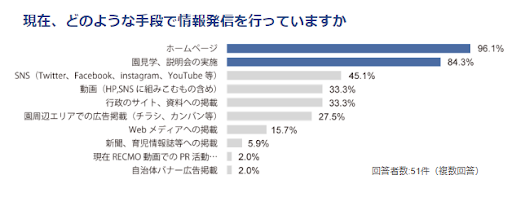 「ホームページの活用」が96.1%、次いで、「園見学・説明会の実施」が84.3%、「SNSの活用」が45.1%という結果となった。