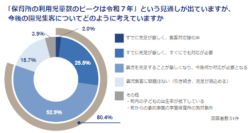 法人の80.4%が園児集客に課題を感じており、「今後何か対応が必要となる」と回答した法人が52.9%、すでに充足が厳しく「すぐにでも対応が必要」と回答した法人は25.5%となった。さらに「集客対応強化中」との回答もあり、利用児童数減少への対策が求められる結果となった。