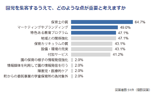 園児集客において重要となる点については、「保育士の質」という回答が最も多く、64.7%となった。次いで、「マーケティングやブランディング」49%、「特色ある教育プログラム」「地域との関係強化」が47.1% となった。その他、「保育カリキュラムの質」「設備・環境の充実」などの声もあがった。