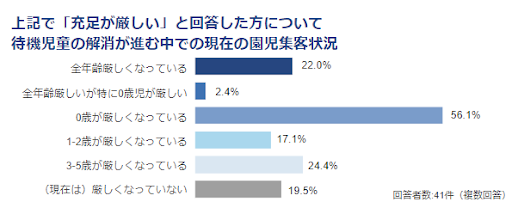 また、園児集客に課題を感じている法人に現在の園児集客状況を聞いたところ、「0歳児の集客が厳しい」との回答が56.1%となり、次いで「3‐5歳の集客」が24.4%となった。
