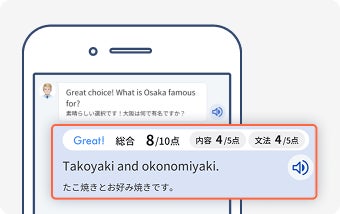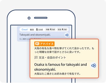 AIアドバイスの機能により、改善ポイントをその場で理解することができます。また、例文の音声再生機能もあるため、『正しい表現と発音』を同時に学習できます。