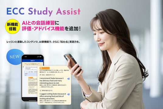 総合教育・生涯学習機関の株式会社ECC(本社:大阪市北区、代表取締役社長:花房雅博)が運営するECC外語学院は、2026年4月1日(水)より「初級~中級英会話コース」に導入しているECCの学習支援アプリ「ECC Study Assist」(以下、本アプリ)に、新機能「AI評価・アドバイス機能」を追加搭載いたします。