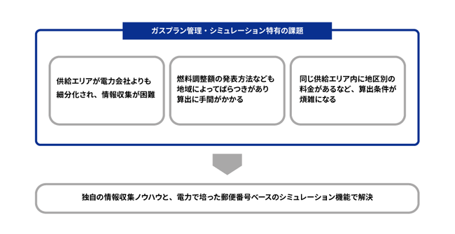 2017年4月の都市ガス自由化以降、都市ガス小売市場は拡大傾向にあり、家庭の契約では他社に切り替えるケースが増えています。他社へのスイッチングの割合は2019年5月時点の契約数全体の約9.4%から、2021年6月末時点で約15.9%(※2)と増加しています。市場の拡大に伴い、ウェブサイト上での料金プランの比較・シミュレーションのニーズは高まっています。しかし「供給エリアが電力会社よりも細分化されており情報収集が困難」「燃料調整額の発表方法などが地域によってばらつきがあり、算出に手間がかかる」といった都市ガス特有の課題があり、その情報管理は都市ガス小売事業者にとって負担の大きいものとなっていました。今回提供を開始した「都市ガス料金Simulation API / Plan API」は、低コスト・都市ガス小売事業者の人的負担なしでプラン情報やシミュレーションを導入することができるクラウドサービスです。