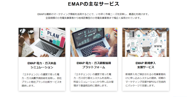 当社が電力自由化開始当初から比較事業で培った資産およびノウハウを活用し、電力事業のデジタル化、高効率化を検討する事業者向けに開発したSaaSプラットフォームです。「EMAP」は小売事業の立ち上げ、ウェブを活用した顧客獲得支援から顧客管理システムの導入・リプレイスにいたるまでのサービスをワンストップでサポートするサービスです。