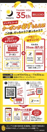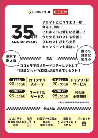 1988年日本のバブル期と共に誕生した「プロント」と「ビッグエコー」は、くつろぎの場や歌う楽しさを提供しながら、癒し・憩い・ストレス発散・気分転換と様々な場面で、多くの人々に元気を与えてきました。2020年からは夜の街場から灯が消え苦しい時期が続きました。そんな時期を乗り越え2023年、沢山の方々に支えられながら35周年を迎えることが出来た「プロント」と「ビッグエコー」は、この度タッグを組み再び街場に元気を取り戻すべく『プロント×ビッグエコー THANK YOU 35th キャンペーン』を実施することにいたしました。