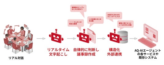 従来の議事録作成ツールが記録・共有にとどまるのに対し、本サービスは「AQ-AIエージェント」シリーズの一つとして他のAIエージェントと連携可能であり、会議で抽出されたタスクや決定事項を業務プロセスへと繋げることができます。