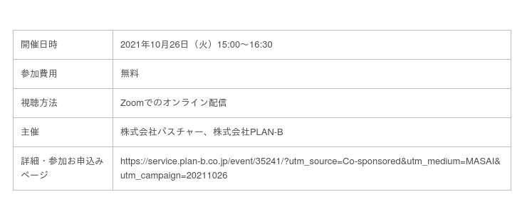詳細・参加お申込みページ:https://service.plan-b.co.jp/event/35241/?utm_source=Co-sponsored&utm_medium=MASAI&utm_campaign=20211026