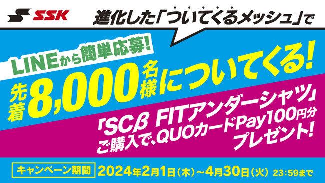株式会社クオカード(以下当社、本社:東京都中央区、代表取締役社長:近田 剛)が展開するスマートフォンで使えるデジタルギフト『QUOカードPay(クオ・カード ペイ)』は、株式会社エスエスケイ(本社:大阪府大阪市、代表取締役社長:佐々木 恭一)が2月1日(木)より開催する「進化した『ついてくるメッシュ』で先着8,000名様についてくる!『SCβ FITアンダーシャツ』ご購入でQUOカードPay100円分プレゼントキャンペーン」にて採用されました。