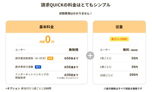 「請求QUICK」は、法制度対応と業務効率化を実現するクラウド型請求書管理システム(SaaS)をベースに3つのFinTech機能が組み込まれており、月額無料からご利用いただくことができます。金融機関とのAPI連携による自動明細取得機能で面倒な入出金の消込作業を大幅に効率化する「消込QUICK」、発行した請求書をクレジットカードでオンライン決済できる「クレカQUICK」、発行した請求書をWeb完結で資金化できるオンラインファクタリング「入金QUICK」という3つのFinTech機能を、すべて1つのシステムで提供しています。