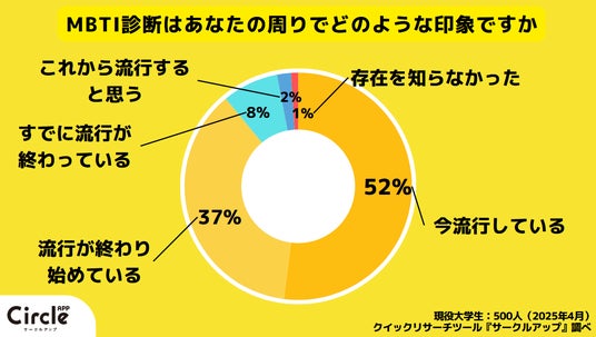 MBTI診断はあなたの周りでどのような印象ですか?という質問に対して、これから流行すると思うと回答した人は2%、今流行していると回答した人は52%、流行が終わり始めていると回答した人は