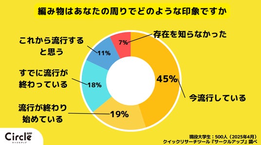 編み物はあなたの周りでどのような印象ですか?という質問に対し、これから流行すると思うと回答した人は11%、今流行していると回答した人は45%、流行が終わり始めていると回答した人は19%、すでに流行が終わっていると回答した人は18%、存在を知らなかったと回答した人は7%でした。