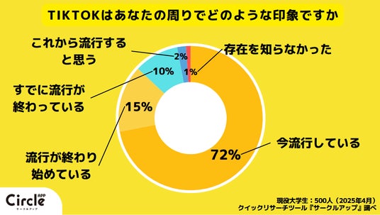 TikTokはあなたの周りでどのような印象ですか?という質問に対し、これから流行すると思うと回答した人は2%、今流行していると回答した人は72%、流行が終わり始めていると回答した人は15%、すでに流行が終わっていると回答した人は10%、存在を知らなかったと回答した人は1%でした。