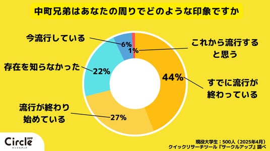 中町兄弟はあなたの周りでどのような印象ですか?という質問に対して、これから流行すると思うと回答した人は1%、今流行していると回答した人は6%、流行が終わり始めていると回答した人は27%、すでに流行が終わっていると回答した人は44%、存在を知らなかったと回答した人は22%でした。