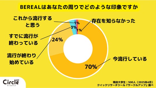 Berealはあなたの周りでどのような印象ですか?という質問に対して、これから流行すると思うと回答した人は1%、今流行していると回答した人は70%、流行が終わり始めていると回答した人は24%、すでに流行が終わっていると回答した人は3%、存在を知らなかったと回答した人は1%でした。