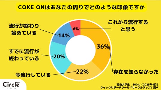 coke onはあなたの周りでどのような印象ですか?という質問に対して、これから流行すると思うと回答した人は6%、今流行していると回答した人22%、流行が終わり始めていると回答した人は14%、すでに流行が終わっていると回答した人は20%、存在を知らなかったと回答した人は36%でした。