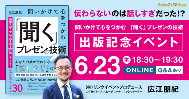 株式会社翔泳社(本社:東京都新宿区舟町5、代表取締役社長:佐々木幹夫)が運営するテクノロジーで営業活動を支援するWebメディアSalesZine(セールスジン)は、次世代のBtoB営業を目指す営業リーダー・営業パーソンのためのウェビナー「SalesZine Hour Vol.2 伝える×セールス」を2022年6月23日(木)に開催します。今回は、書籍『問いかけて心をつかむ 「聞く」プレゼンの技術』の出版を記念し、著者の広江朋紀氏が登壇。参加費は無料です(事前登録制)。