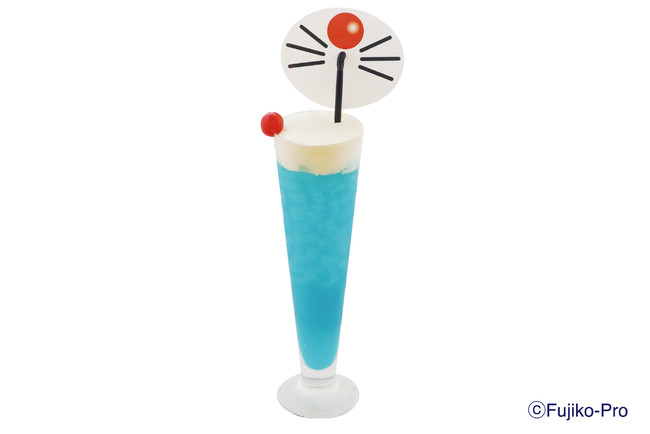 ドラミちゃんのフォルムをイメージした、丸いグラスでご提供するパイナップルとレモンのジュース。ドラミちゃんのリボンつきです。