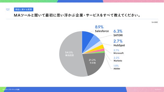 「Q2. MAツールと聞いて最初に思い浮かぶ企業・サービスをすべて教えてください。(自由回答)」(n=200)と質問したところ、Salesforceが8.9%、SATORIが6.3%、という回答となりました。