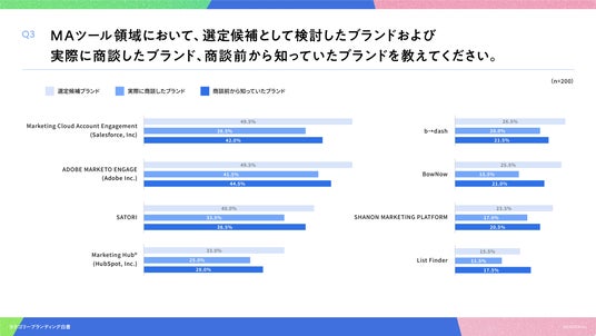「Q3. MAツール領域において、選定候補として検討したブランドおよび実際に商談したブランド、商談前から知っていたブランドを教えてください。」(n=200)と質問したところ、選定候補ブランドはMarketing Cloud Account Engagement が49.5%、実際に商談したブランドはADOBE MARKETO ENGAGE が41.5%、商談前から知っていたブランドはADOBE MARKETO ENGAGE が44.5%という回答となりました。