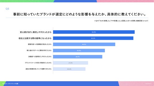 「Q5. Q4で「大きく影響した」「やや影響した」と回答した方にお聞きします。事前に知っていたブランドが選定にどのような影響を与えたか、具体的に教えてください。(複数回答)」(n=127)と質問したところ、「安心感があり、検討しやすかったから」が63.0%、「他社と比較する際の基準になったから」が62.2%、「提案内容への信頼度が高まったから」が48.0%という回答となりました。