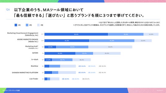 「Q6. Q1で全て「知らない」以外を回答した方にお聞きします。以下企業のうち、MAツール領域において「最も信頼できる」「選びたい」と思うブランドを順に3つまで挙げてください(順位付けかつ上位3つまで)」(n=181)と質問したところ、回答の選出数が多い順に、1位に選ばれた割合の「1位率」はMarketing Cloud Account Engagementが56.4%、ADOBE MARKETO ENGAGEが41.8%、Marketing Hub(R)が14.4%、SATORI が41.0%という回答となりました。
