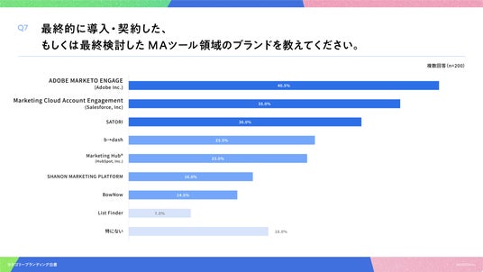 「Q7. 最終的に導入・契約した、もしくは最終検討したSEOツール領域のブランドを教えてください。(複数回答)」(n=200)と質問したところ、ADOBE MARKETO ENGAGEが40.5%、Marketing Cloud Account Engagement が35.0%、SATORI が30.0%という回答となりました。