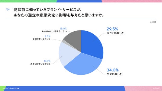 「Q4. 商談前に知っていたブランド・サービスが、あなたの選定や意思決定に影響を与えたと思いますか。」(n=200)と質問したところ、「大きく影響した」が29.5%、「やや影響した」が34.0%という回答となりました。