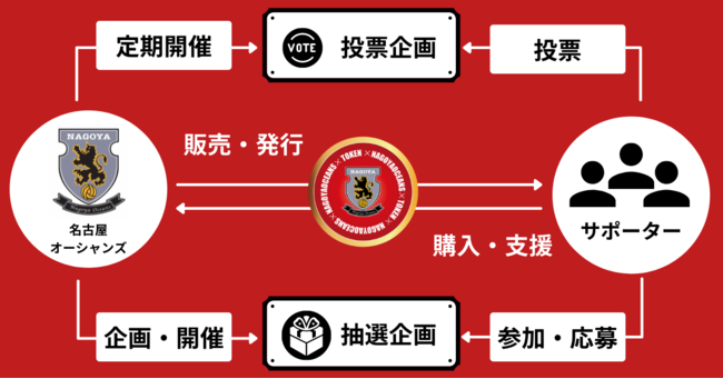 名古屋オーシャンズのトークンは”オーシャンズトークン”としてFiNANCiE上で発行されます。トークンを購入いただいた方々は、コミュニティにご参加いただき、クラブの運営の一部に携われる投票企画への参加や特典抽選などへ応募いただくことができます。