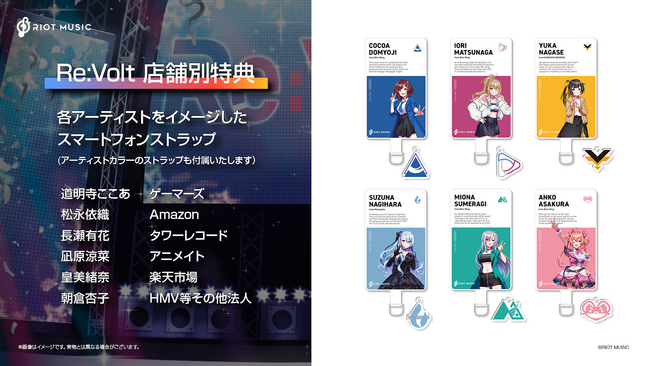 「ゲーマーズ」では道明寺ここあ、「Amazon」では松永依織、「タワーレコード」では長瀬有花、「アニメイト」では凪原涼菜、「楽天市場」では皇 美緖奈、「HMV」や「とらのあな」等では朝倉杏子と、それぞれの店舗別にアーティストをイメージしたスマートフォンストラップ(非売品)をお渡しいたします。
