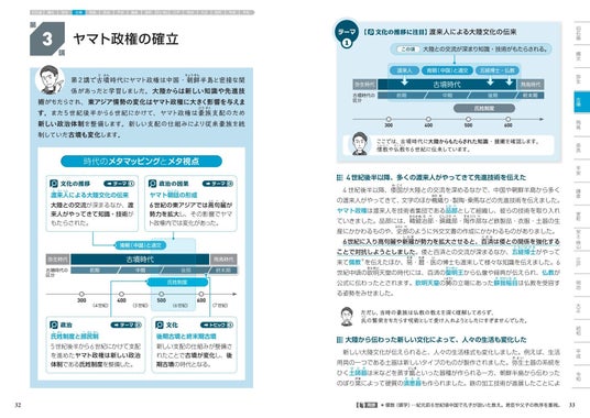 各講義の最初に掲載されている「メタ視点とメタマッピング」によって、どの時代の、どの内容を学習しているのか、どの点に注目すれば良いのかを確認することができます。学習の全体像が最初に理解できるので、時代の流れ、変化、因果関係、歴史事象の関係性を、前後の時代も含めた広い視点・視野で学習できます。