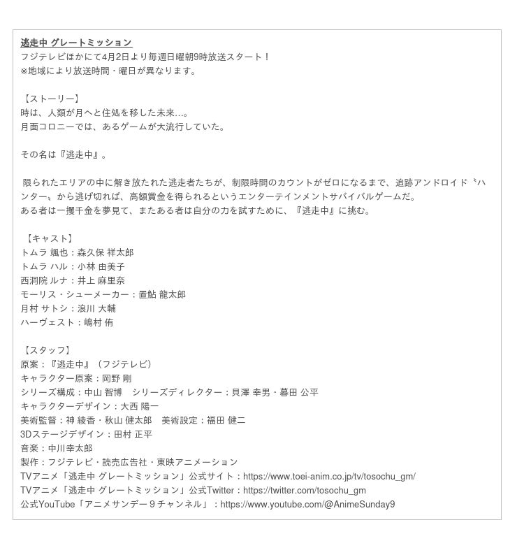 4月2日(日)より放送が開始されるTVアニメ「逃走中 グレートミッション」より、キャラクター原案 岡野剛先生描き下ろしビジュアルがコメント共に解禁となりました。