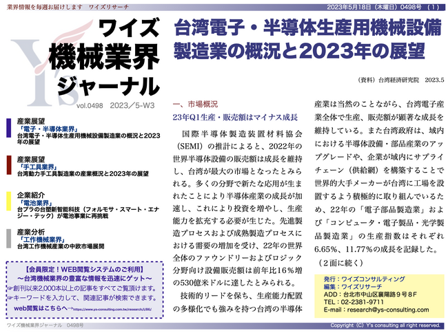 ワイズコンサルティング グループ(本社:中華民国台北市、代表取締役:吉本康志)は台湾機械業界専門誌「ワイズ機械業界ジャーナル」の2023年5月第2週号を発行しました。今週号では半導体業界、手工具業界、電気自動車用電池業界、工作機械の動向を紹介します。