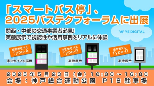 株式会社YE DIGITAL(本社:北九州市小倉北区、代表取締役社長:玉井裕治、以下YEデジタル)が提供する「スマートバス停」を、2025年5月23日(金)に兵庫県神戸市で開催される『2025バステクフォーラム』に出展します。