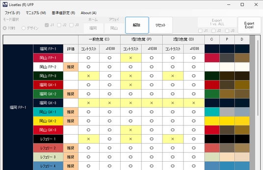 東洋インキが新たに開発した「Lioatlas(R) UFP(Uniform Palette)」は、Jリーグの全60クラブのユニフォームのデータベースの中から、それぞれの対戦カード毎に識別がしやすいユニフォームの組み合わせを簡単に選ぶことができます。また、新しいユニフォームをデザインする際に、識別しやすい色を提案するデザインモードも搭載しています。