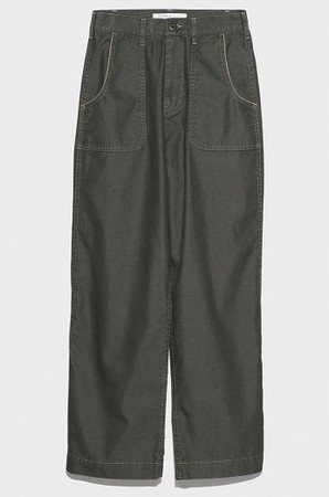 デニムの名産地、岡山県児島の〈ジョンブル〉とコラボレート。オーガニックコットンと再生ポリエステルの交織生地にユーズド加工を施した、大人の女性も履きやすい落ち着いたグリーンのベイカーパンツ。