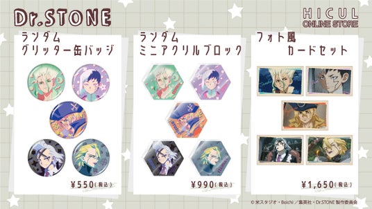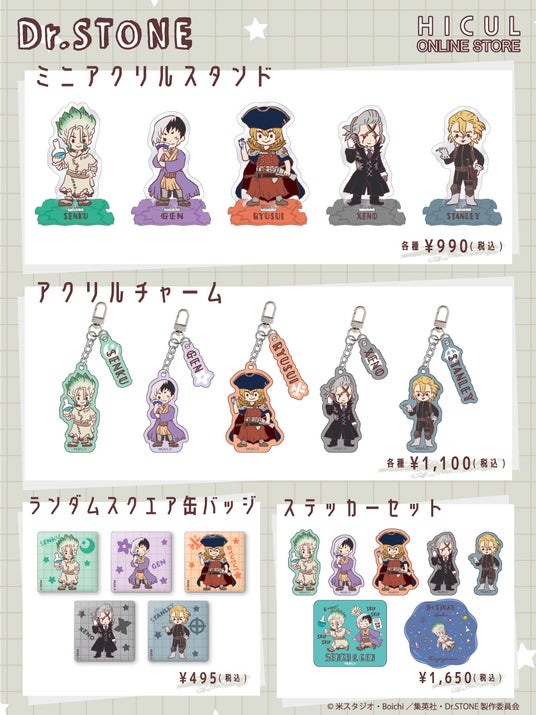 石神千空・あさぎりゲン・七海龍水に加え、アニメ第4期から登場するDr.ゼノとスタンリー・スナイダーをラインナップ!定番のアクリルスタンドや缶バッジの雑貨系はもちろん、Tシャツやパーカーなどのアパレルアイテムも販売いたします。