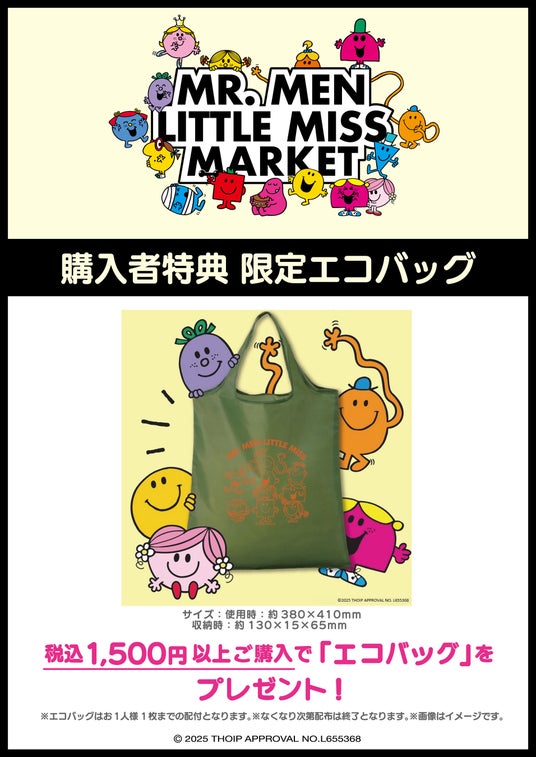 「MR.MEN LITTLE MISS MARKET」で「MR.MEN LITTLE MISS」商品を1点以上お買い上げの方に「ステッカー」と「ショッパー」をそれぞれ1点ずつプレゼント。さらに、税込1,500円以上のお買い上げで「エコバッグ」を1点プレゼントいたします。