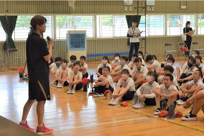 講演ではバスケットボール選手になったきっかけなどを話し、生徒からも多くの質問をいただきました。講演後は体育の授業でバスケットボールで実際に試合を行うなど、一緒に身体を動かしました。