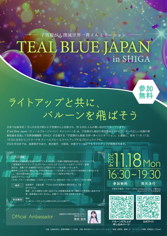 株式会社ファーストイノベーション(本社:東京都中央区、代表取締役社長:木ノ根雄志、以下ファーストイノベーション)は、2024年11月18日に滋賀県庁で開催される子宮頸がん撲滅啓発のためのイルミネーションイベント「TEAL BLUE JAPAN in SHIGA」に共催企業として参加します。本イベントでは、世界中で同時に行われるライトアップが実施され、日本国内でも子宮頸がん予防の啓発活動を広めることを目的としています。