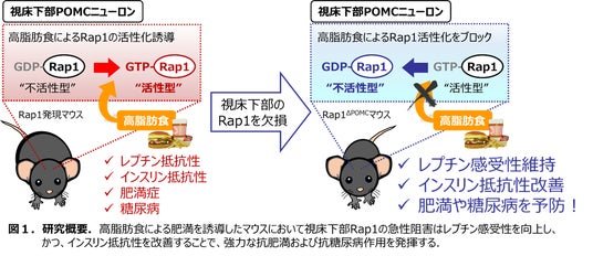 明治大学農学部農芸化学科の金子賢太朗専任講師とベイラー医科大学小児科の福田真Associate Professorをはじめとする国際共同研究グループは、視床下部※1 のRap1※2 分子を阻害することにより急速に糖尿病が改善する新しいメカニズムを解明しました。過栄養状態によって誘導した肥満糖尿病様病態において、視床下部に存在する全身の代謝調整の司令塔として機能するPOMCニューロン※3 という特殊な脳細胞内からRap1分子を欠損させることにより、体重には依存せず血糖値を正常化できることを明らかにしました(図1)。本成果により、脳のRap1分子を標的とした新しい糖尿病治療薬の開発につながることが期待されます。