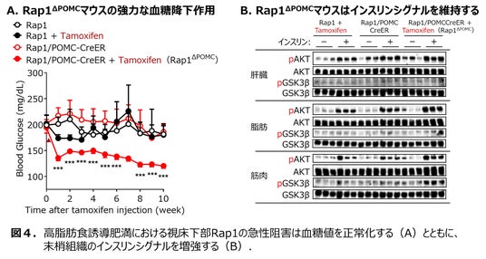 私たちの研究グループは、脳のレプチンシグナルを負に調節する因子として、低分子量 GTPase Rap1 を同定しました(文献1)。さらにバージニア工科大学のMorozov博士からRap1floxマウスの提供をいただき、脳のRap1を遺伝学的および薬理学的に欠損/阻害することによって、レプチン抵抗性、インスリン抵抗性、肥満および高血糖を改善することを明らかにしています(文献1および文献2)。本研究では、全身の代謝調節に関わる視床下部POMC ニューロンにおける Rap1 が、レプチン感受性とグルコース恒常性の調節に重要な役割を果たしていることをマウス遺伝学を用いて実証しました(図2)。Rap1を視床下部にごくわずかに存在するPOMCニューロン(約3000細胞/数億細胞)から選択的に除去したところ、抗肥満効果およびレプチン抵抗性の改善効果が発揮されることを見出しました(図3)。さらに驚くべきことに、わずか1週間で高血糖が急速に正常化することを発見しました(図4)。高脂肪食を長期間摂取し肥満および糖尿病になっているにもかかわらず、POMCニューロンのRap1を除去することで、肝臓や脂肪、筋肉といった血糖値制御に関わる組織のインスリンシグナル伝達が強化され、インスリン抵抗性が改善することも明らかにしました(図4)。私たちの本研究を含めた一連の研究成果により、脳の Rap1 がレプチン感受性とグルコース代謝の重要な調節因子であることが特定され、視床下部のRap1を標的とすることが、高血糖を低下させ糖尿病状態を改善する有望なアプローチになる可能性を示しています(図1)。
