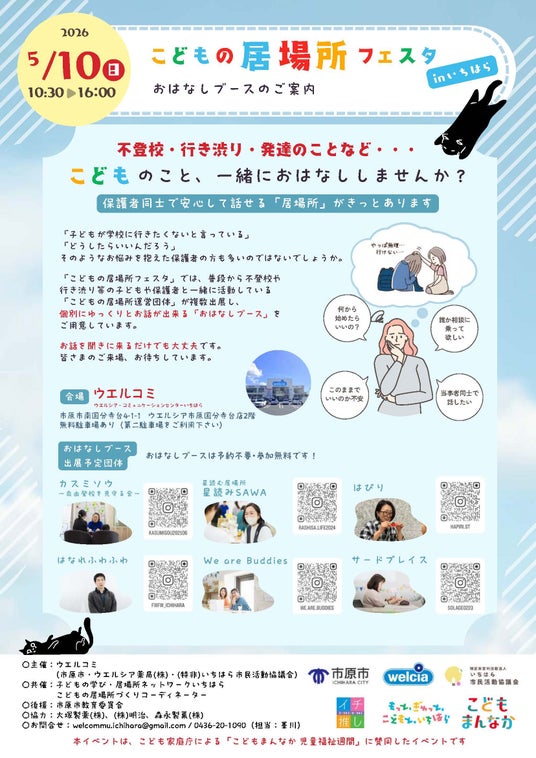 「こどもの居場所フェスタinいちはら」は、市原市内を中心にこどもの居場所づくりに取り組む市民活動団体、地域活動に取り組む企業、行政の協働によるイベントです。今回は3つの大学の学生たちも初参加し、こどもたちと一緒に体験できる企画やブース運営を行います。