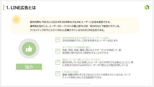 本資料では、LINE広告の配信面や事業で活用できるLINE広告の機能についてなど、より詳しく掲載しています。
