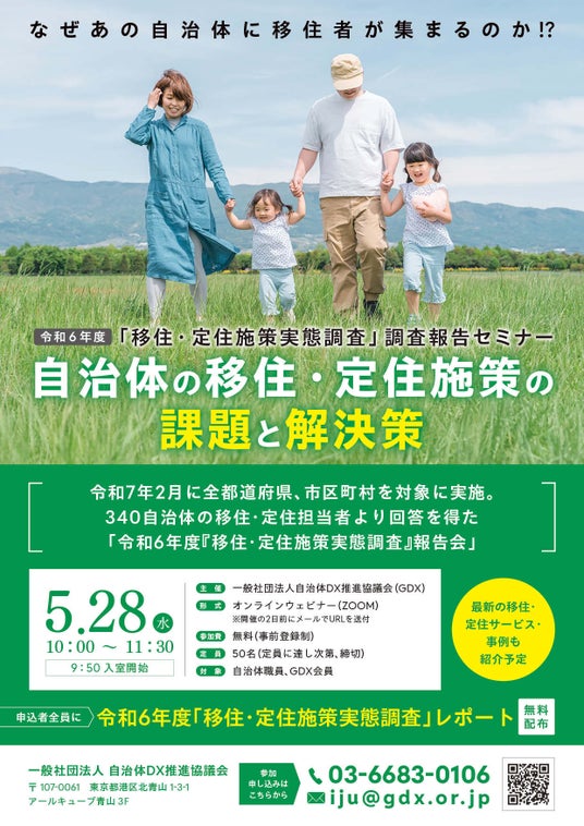 一般社団法人自治体DX推進協議会は、「令和6年度 移住・定住施策実態調査報告書」の発表を記念し、オンライン報告会を5月28日(水)に開催いたします。この度、報告会のタイムテーブルが決定いたしましたので、お知らせいたします。