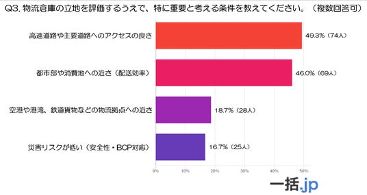 調査結果3:物流倉庫の立地を評価するうえで、特に重要と考える条件を教えてください。※複数回答可(注1)